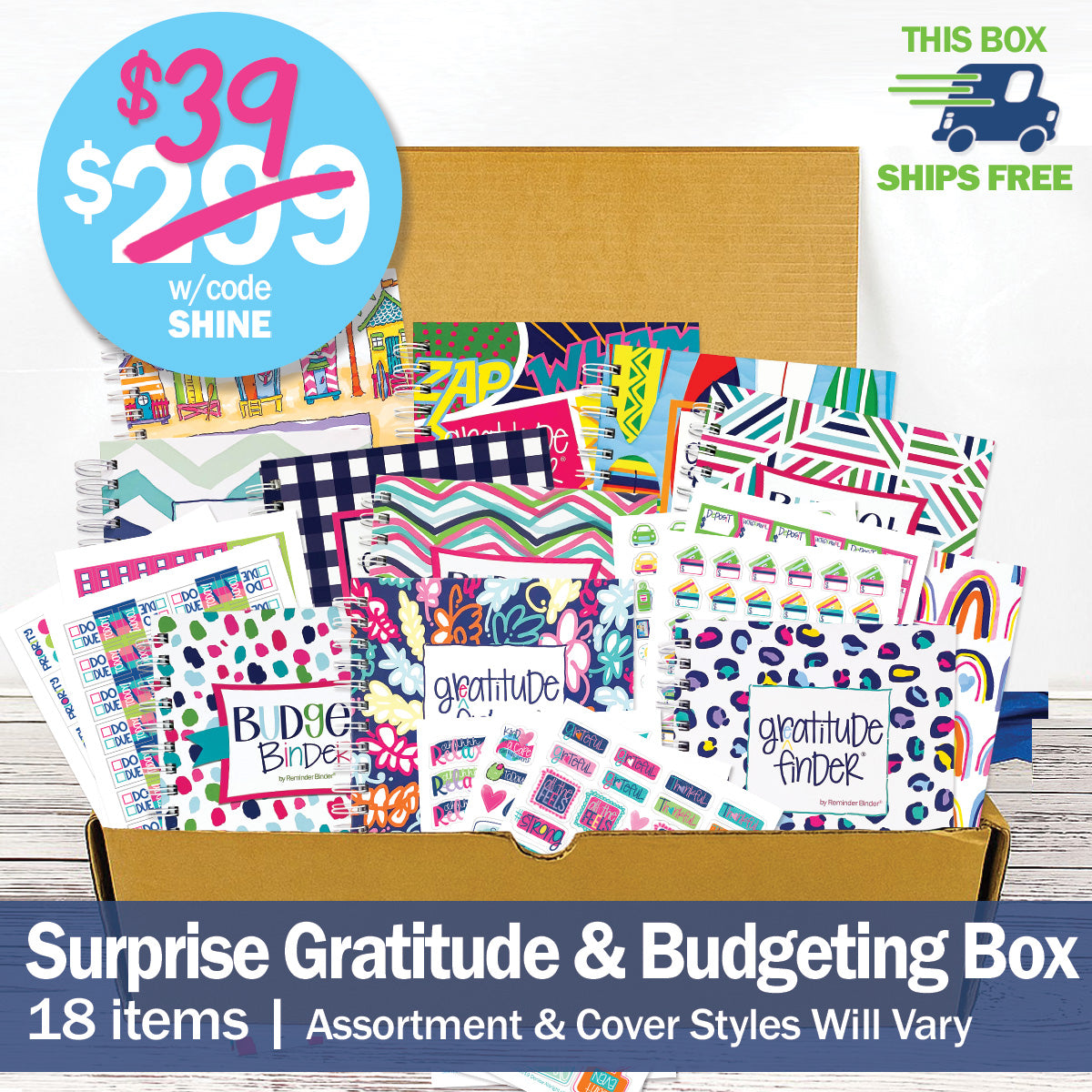 This Surprise Gratitude & Budgeting Box includes a curated assortment of 18 Items Gratitude Finder® Journals, Budget Binders™, and bonus stickers — all brand new, full-size items selected from styles being retired as part of our Warehouse Farewell Event.