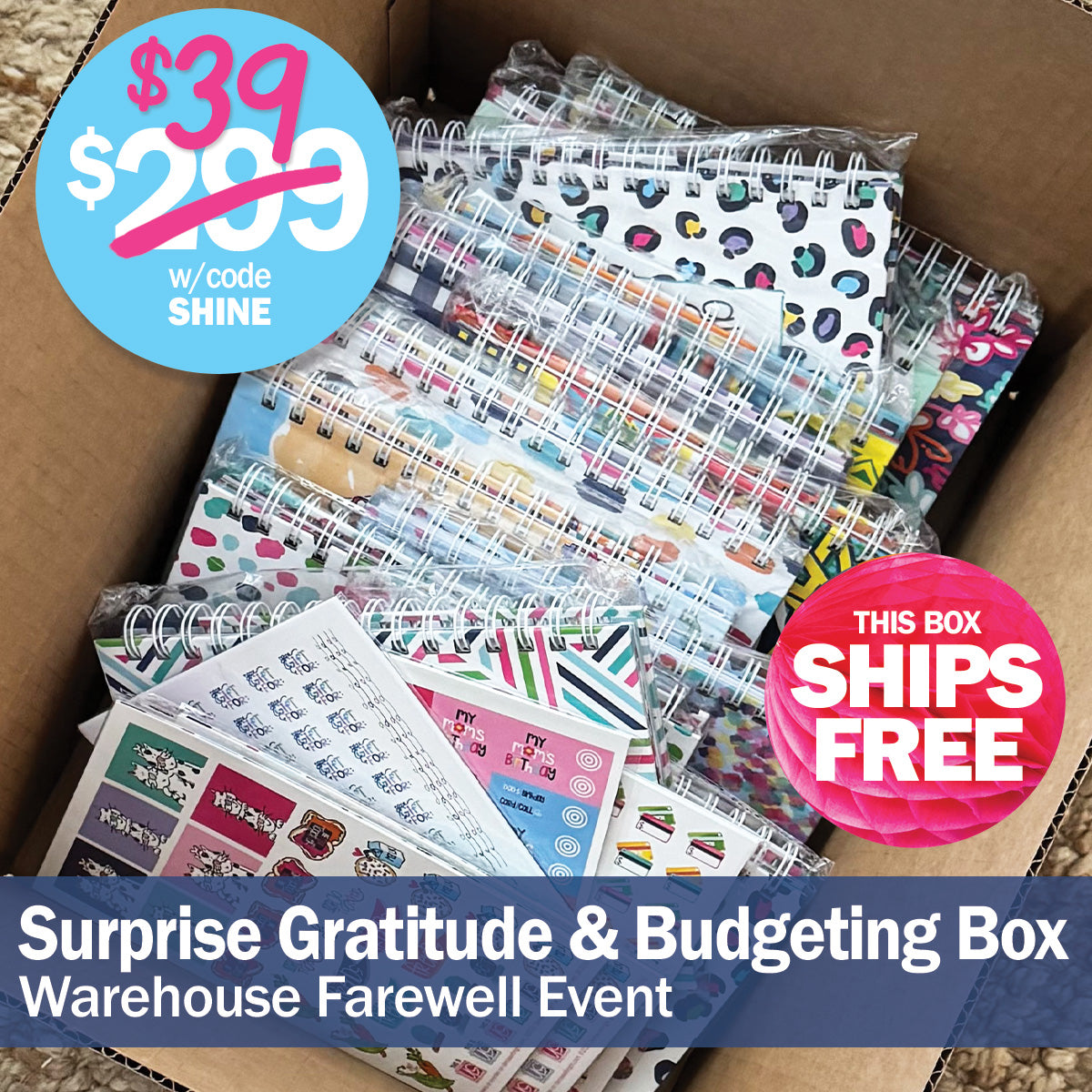 This Surprise Gratitude & Budgeting Box includes a curated assortment of 18 Items Gratitude Finder® Journals, Budget Binders™, and bonus stickers — all brand new, full-size items selected from styles being retired as part of our Warehouse Farewell Event.