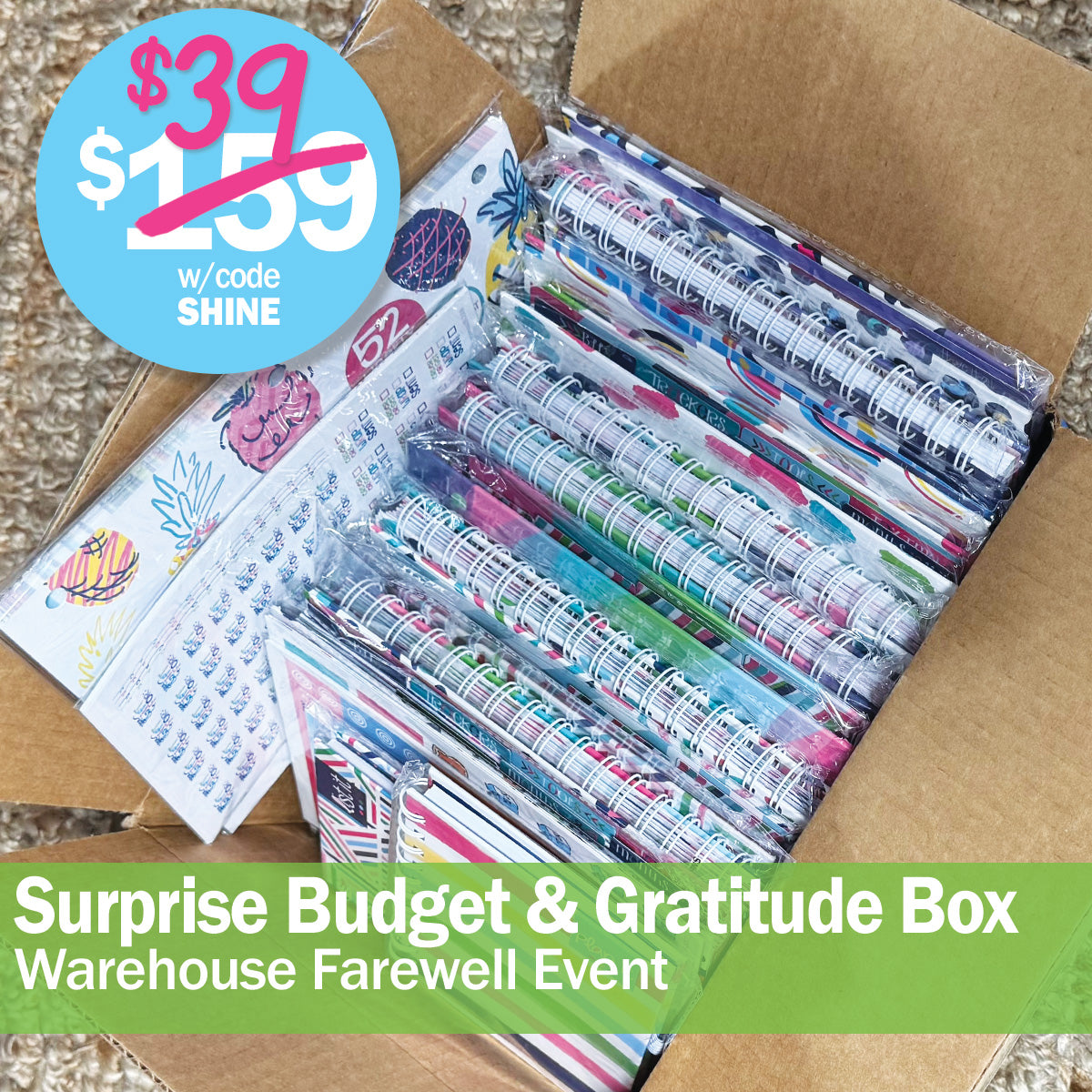 As we make room for what’s next, we’re saying goodbye to select product styles with this Warehouse Farewell Surprise Box. Each box includes a curated assortment featuring Gratitude Journals, Budget Binders, and bonus paper goods like pads, pocket notes, and stickers.