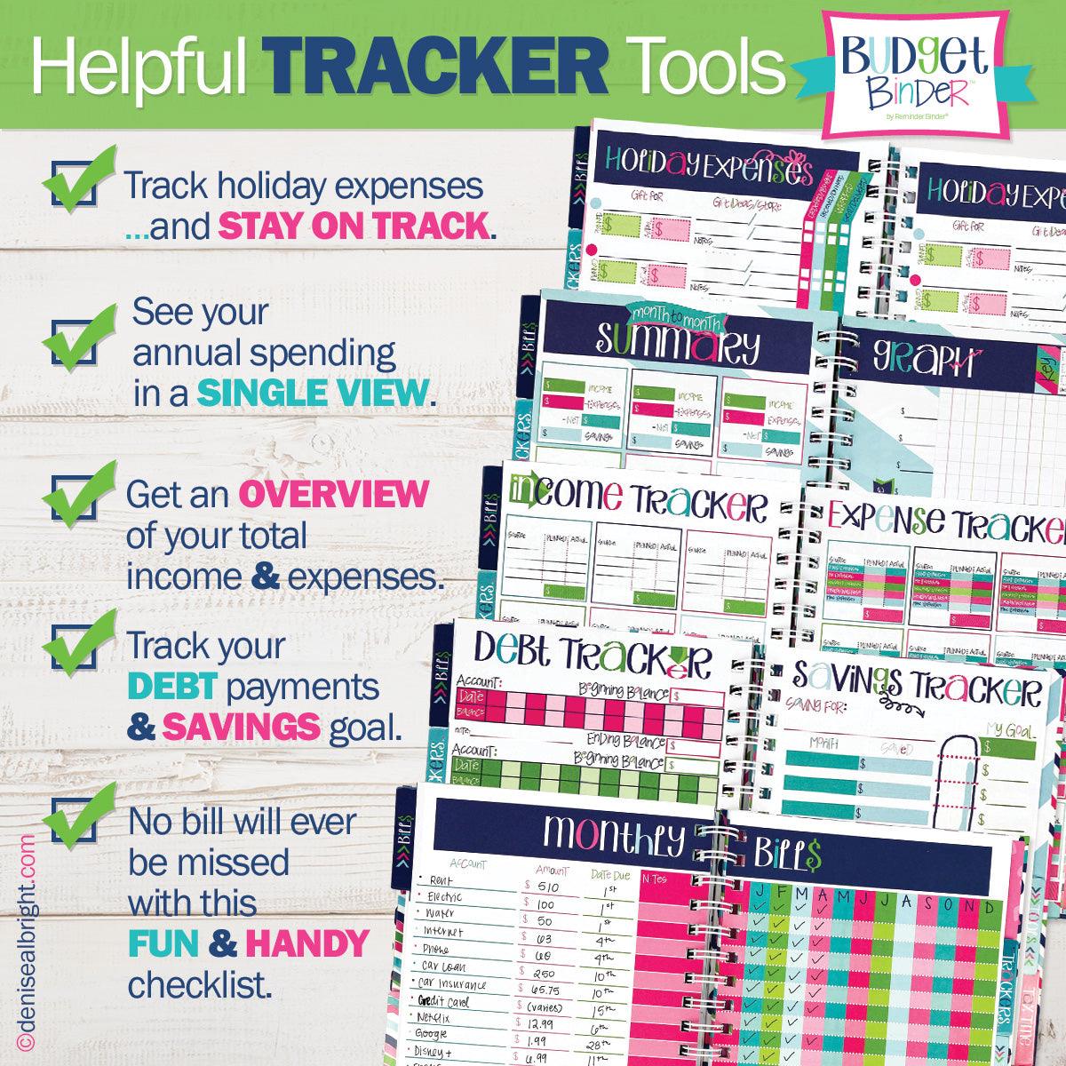 - Trackers for income, expenses, debt & savings for any 12-month period